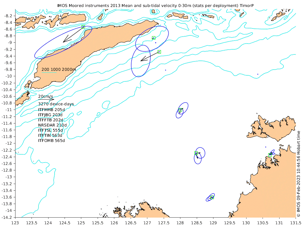These maps show some basic analyses of the velocity data: mean and sub-tidal variance for several layers and time-windows, and tidal harmonics for the depth-average velocity using the whole record. Click through to see more detailed plots of the selected dataset or to download those data from the AODN thredds server.