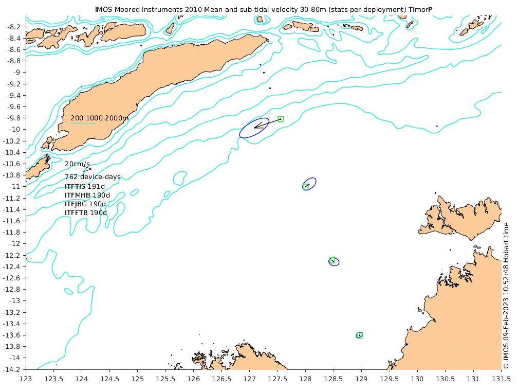 These maps show some basic analyses of the velocity data: mean and sub-tidal variance for several layers and time-windows, and tidal harmonics for the depth-average velocity using the whole record. Click through to see more detailed plots of the selected dataset or to download those data from the AODN thredds server.