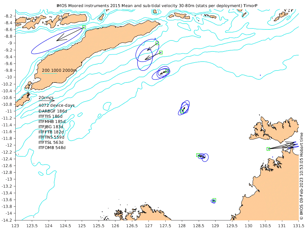 These maps show some basic analyses of the velocity data: mean and sub-tidal variance for several layers and time-windows, and tidal harmonics for the depth-average velocity using the whole record. Click through to see more detailed plots of the selected dataset or to download those data from the AODN thredds server.
