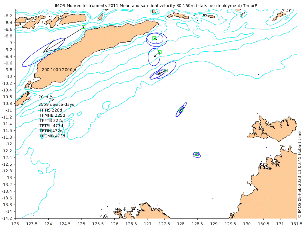 These maps show some basic analyses of the velocity data: mean and sub-tidal variance for several layers and time-windows, and tidal harmonics for the depth-average velocity using the whole record. Click through to see more detailed plots of the selected dataset or to download those data from the AODN thredds server.