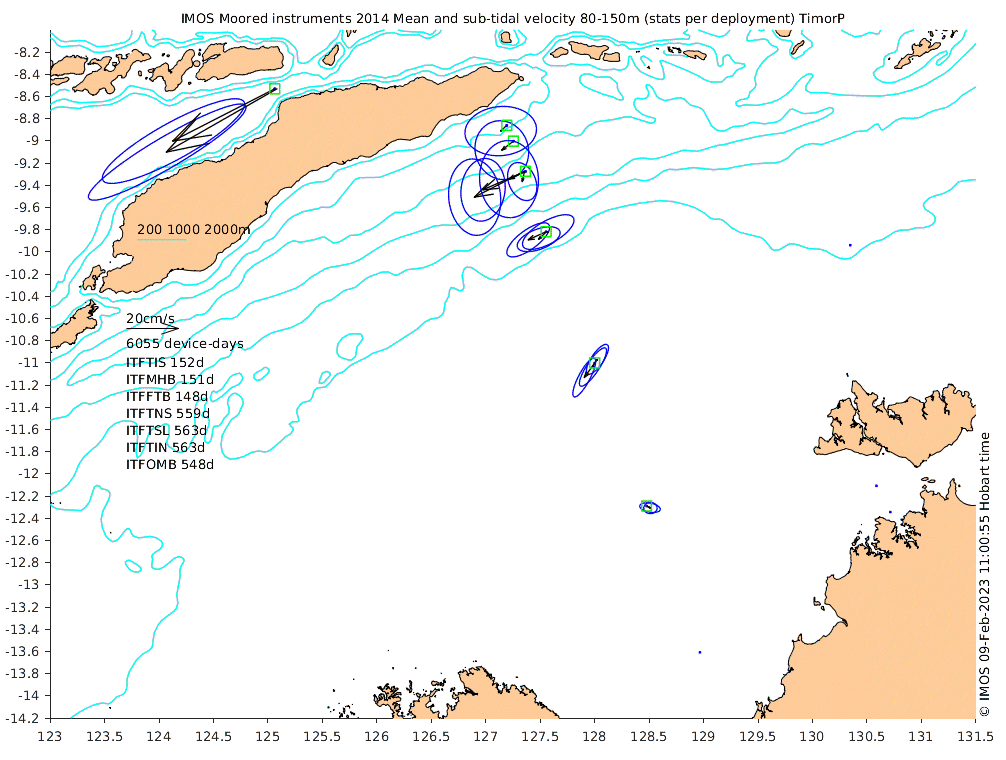 These maps show some basic analyses of the velocity data: mean and sub-tidal variance for several layers and time-windows, and tidal harmonics for the depth-average velocity using the whole record. Click through to see more detailed plots of the selected dataset or to download those data from the AODN thredds server.