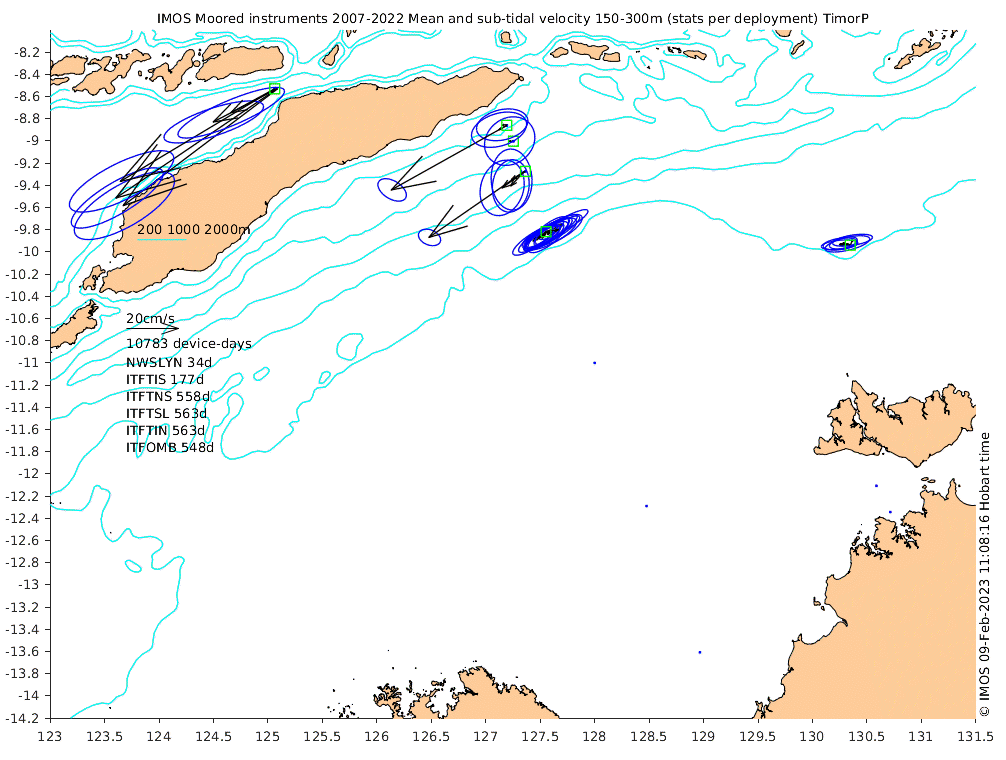 These maps show some basic analyses of the velocity data: mean and sub-tidal variance for several layers and time-windows, and tidal harmonics for the depth-average velocity using the whole record. Click through to see more detailed plots of the selected dataset or to download those data from the AODN thredds server.