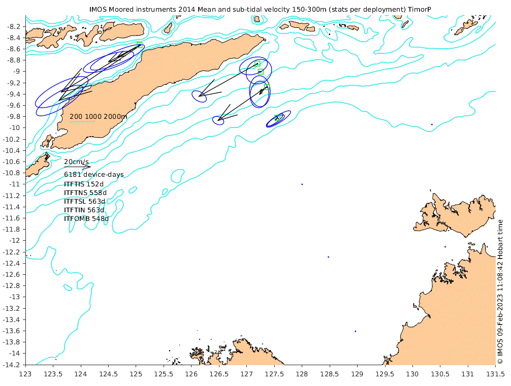 These maps show some basic analyses of the velocity data: mean and sub-tidal variance for several layers and time-windows, and tidal harmonics for the depth-average velocity using the whole record. Click through to see more detailed plots of the selected dataset or to download those data from the AODN thredds server.