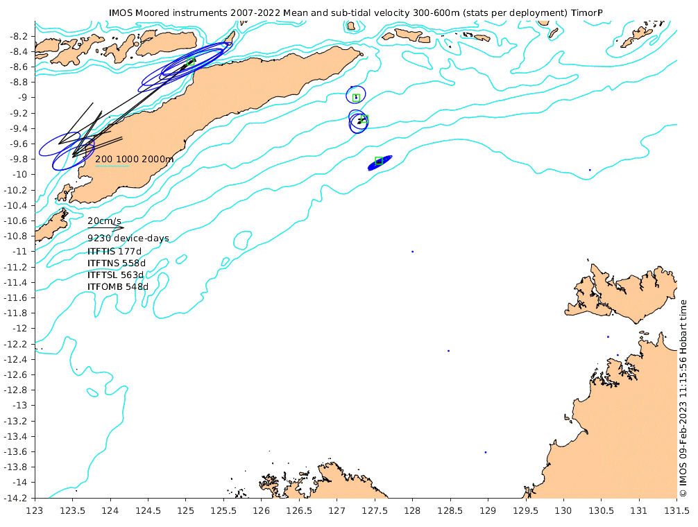 These maps show some basic analyses of the velocity data: mean and sub-tidal variance for several layers and time-windows, and tidal harmonics for the depth-average velocity using the whole record. Click through to see more detailed plots of the selected dataset or to download those data from the AODN thredds server.