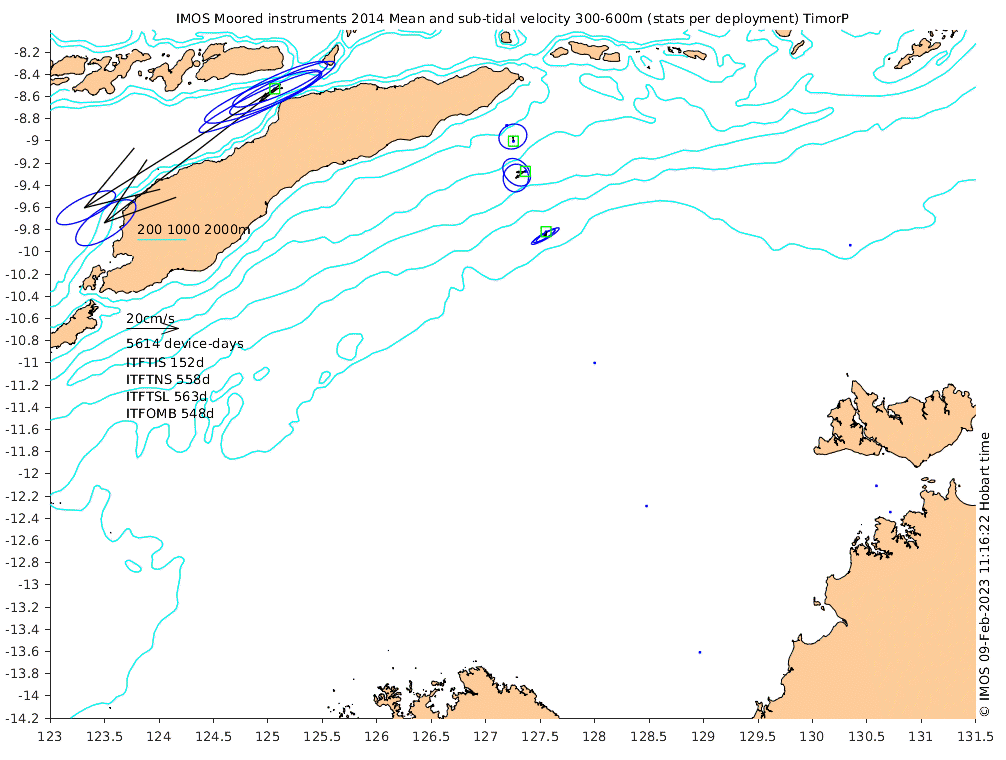 These maps show some basic analyses of the velocity data: mean and sub-tidal variance for several layers and time-windows, and tidal harmonics for the depth-average velocity using the whole record. Click through to see more detailed plots of the selected dataset or to download those data from the AODN thredds server.