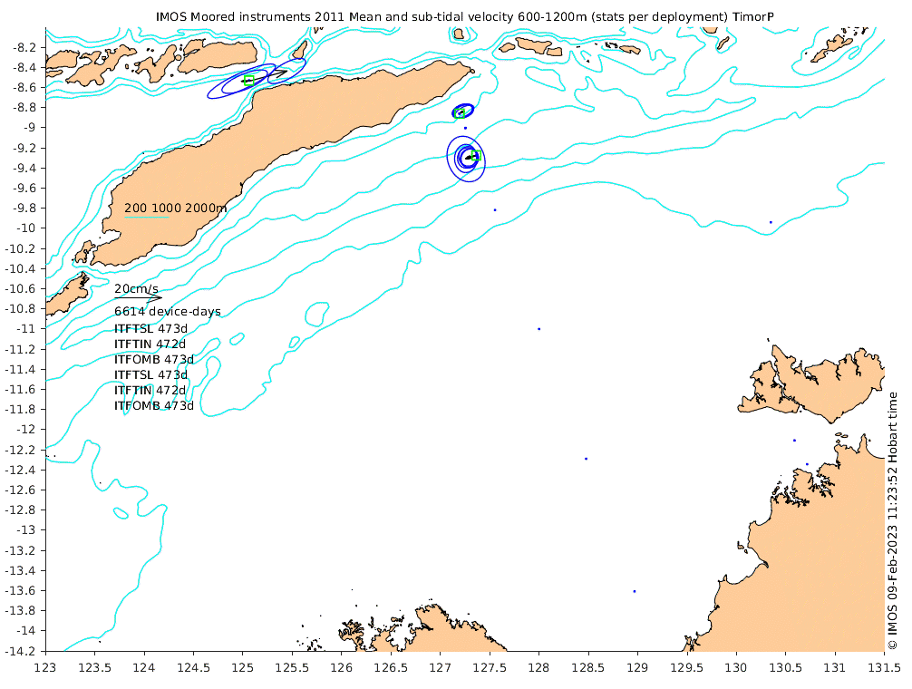 These maps show some basic analyses of the velocity data: mean and sub-tidal variance for several layers and time-windows, and tidal harmonics for the depth-average velocity using the whole record. Click through to see more detailed plots of the selected dataset or to download those data from the AODN thredds server.