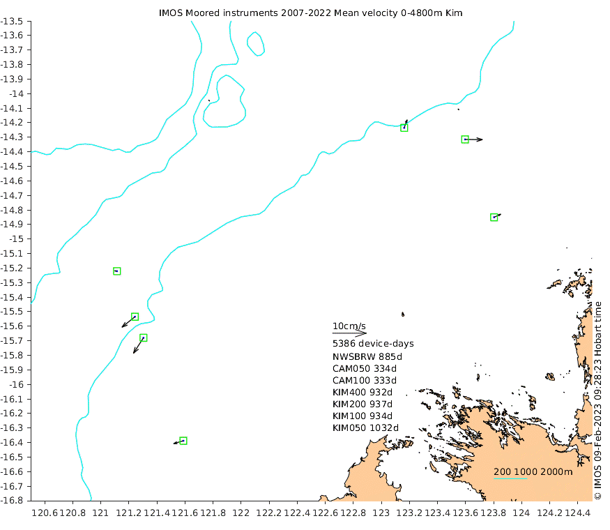 These maps show some basic analyses of the velocity data: mean and sub-tidal variance for several layers and time-windows, and tidal harmonics for the depth-average velocity using the whole record. Click through to see more detailed plots of the selected dataset or to download those data from the AODN thredds server.