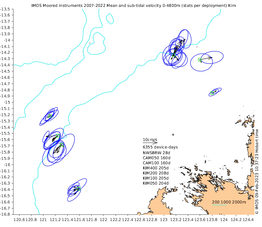 These maps show some basic analyses of the velocity data: mean and sub-tidal variance for several layers and time-windows, and tidal harmonics for the depth-average velocity using the whole record. Click through to see more detailed plots of the selected dataset or to download those data from the AODN thredds server.