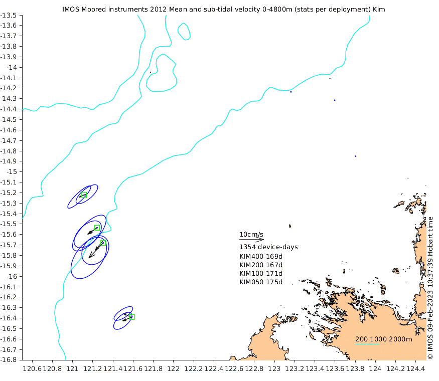 These maps show some basic analyses of the velocity data: mean and sub-tidal variance for several layers and time-windows, and tidal harmonics for the depth-average velocity using the whole record. Click through to see more detailed plots of the selected dataset or to download those data from the AODN thredds server.