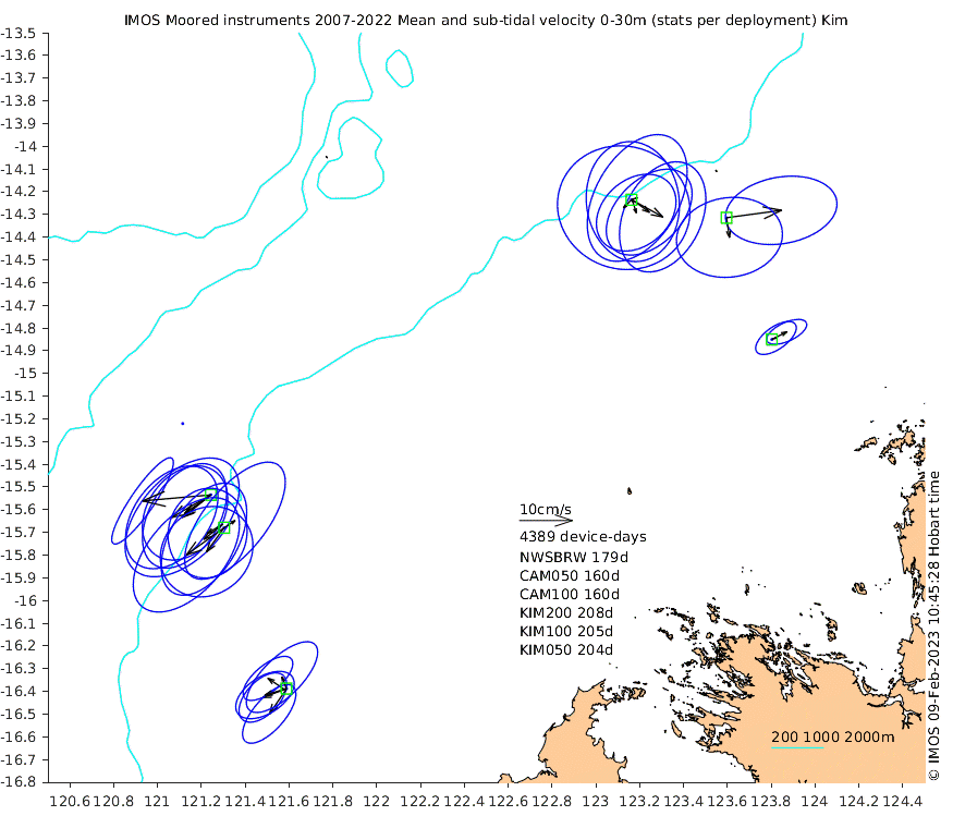 These maps show some basic analyses of the velocity data: mean and sub-tidal variance for several layers and time-windows, and tidal harmonics for the depth-average velocity using the whole record. Click through to see more detailed plots of the selected dataset or to download those data from the AODN thredds server.