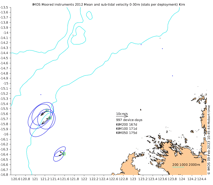 These maps show some basic analyses of the velocity data: mean and sub-tidal variance for several layers and time-windows, and tidal harmonics for the depth-average velocity using the whole record. Click through to see more detailed plots of the selected dataset or to download those data from the AODN thredds server.