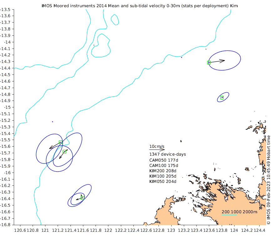 These maps show some basic analyses of the velocity data: mean and sub-tidal variance for several layers and time-windows, and tidal harmonics for the depth-average velocity using the whole record. Click through to see more detailed plots of the selected dataset or to download those data from the AODN thredds server.