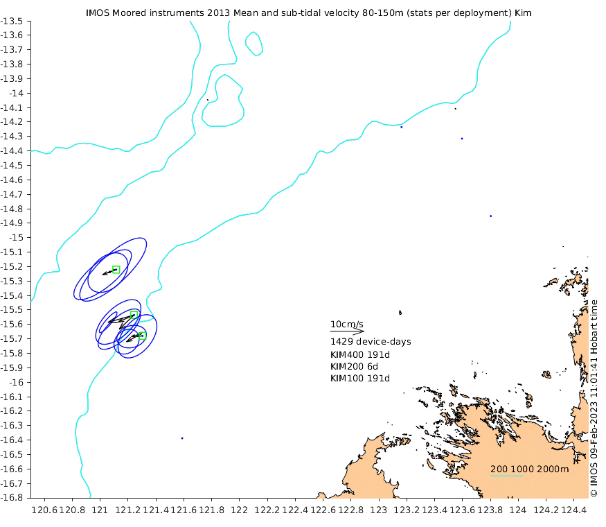 These maps show some basic analyses of the velocity data: mean and sub-tidal variance for several layers and time-windows, and tidal harmonics for the depth-average velocity using the whole record. Click through to see more detailed plots of the selected dataset or to download those data from the AODN thredds server.