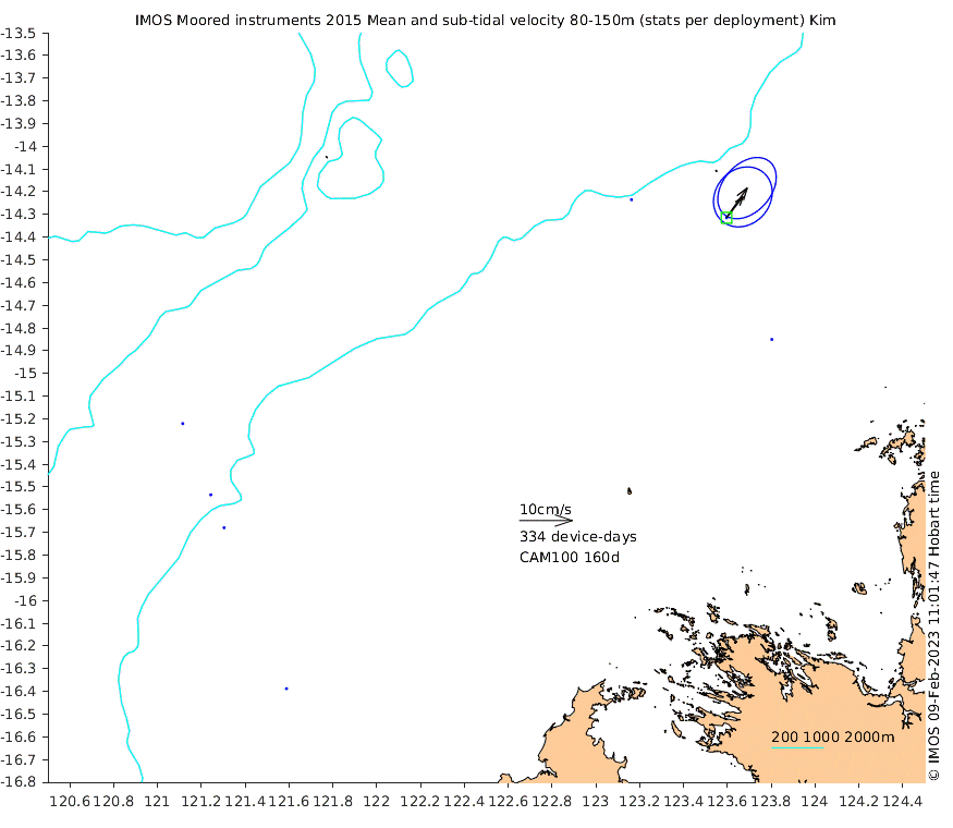 These maps show some basic analyses of the velocity data: mean and sub-tidal variance for several layers and time-windows, and tidal harmonics for the depth-average velocity using the whole record. Click through to see more detailed plots of the selected dataset or to download those data from the AODN thredds server.