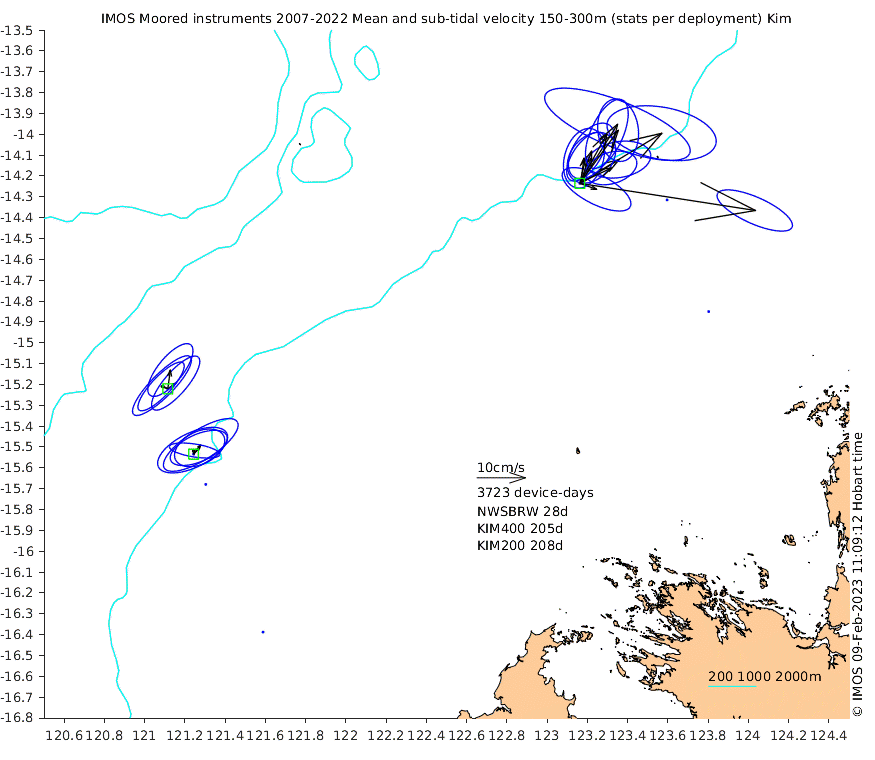 These maps show some basic analyses of the velocity data: mean and sub-tidal variance for several layers and time-windows, and tidal harmonics for the depth-average velocity using the whole record. Click through to see more detailed plots of the selected dataset or to download those data from the AODN thredds server.
