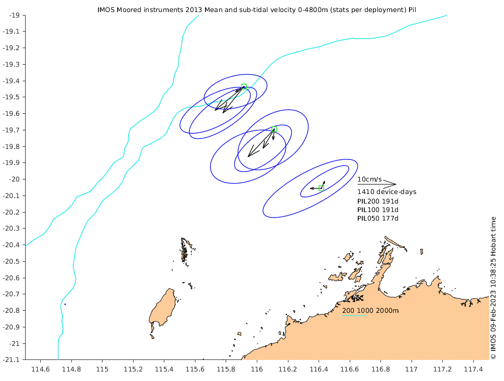 These maps show some basic analyses of the velocity data: mean and sub-tidal variance for several layers and time-windows, and tidal harmonics for the depth-average velocity using the whole record. Click through to see more detailed plots of the selected dataset or to download those data from the AODN thredds server.