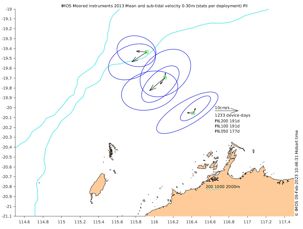 These maps show some basic analyses of the velocity data: mean and sub-tidal variance for several layers and time-windows, and tidal harmonics for the depth-average velocity using the whole record. Click through to see more detailed plots of the selected dataset or to download those data from the AODN thredds server.