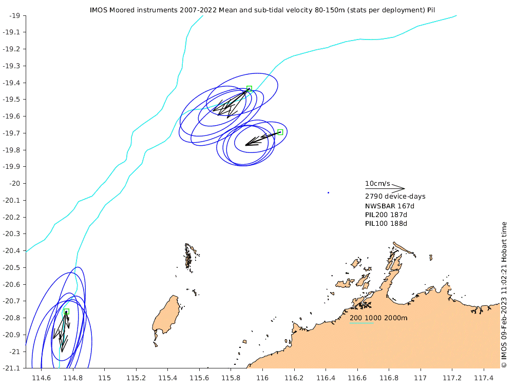 These maps show some basic analyses of the velocity data: mean and sub-tidal variance for several layers and time-windows, and tidal harmonics for the depth-average velocity using the whole record. Click through to see more detailed plots of the selected dataset or to download those data from the AODN thredds server.