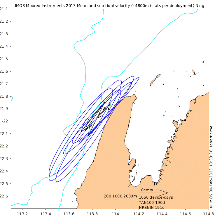 These maps show some basic analyses of the velocity data: mean and sub-tidal variance for several layers and time-windows, and tidal harmonics for the depth-average velocity using the whole record. Click through to see more detailed plots of the selected dataset or to download those data from the AODN thredds server.