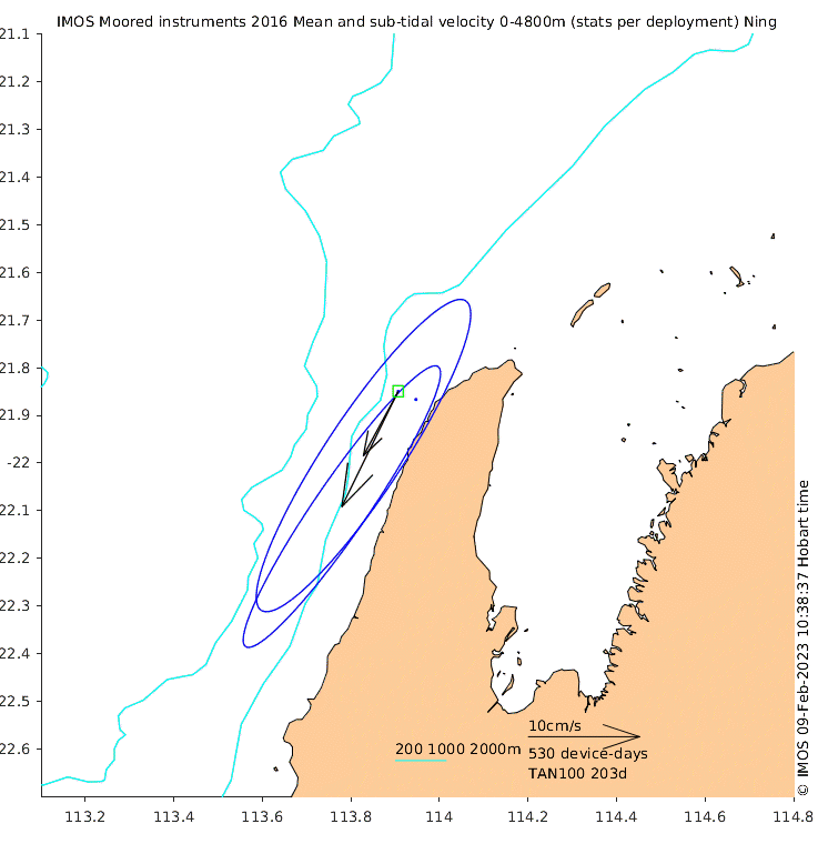 These maps show some basic analyses of the velocity data: mean and sub-tidal variance for several layers and time-windows, and tidal harmonics for the depth-average velocity using the whole record. Click through to see more detailed plots of the selected dataset or to download those data from the AODN thredds server.