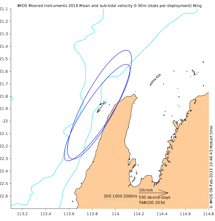 These maps show some basic analyses of the velocity data: mean and sub-tidal variance for several layers and time-windows, and tidal harmonics for the depth-average velocity using the whole record. Click through to see more detailed plots of the selected dataset or to download those data from the AODN thredds server.