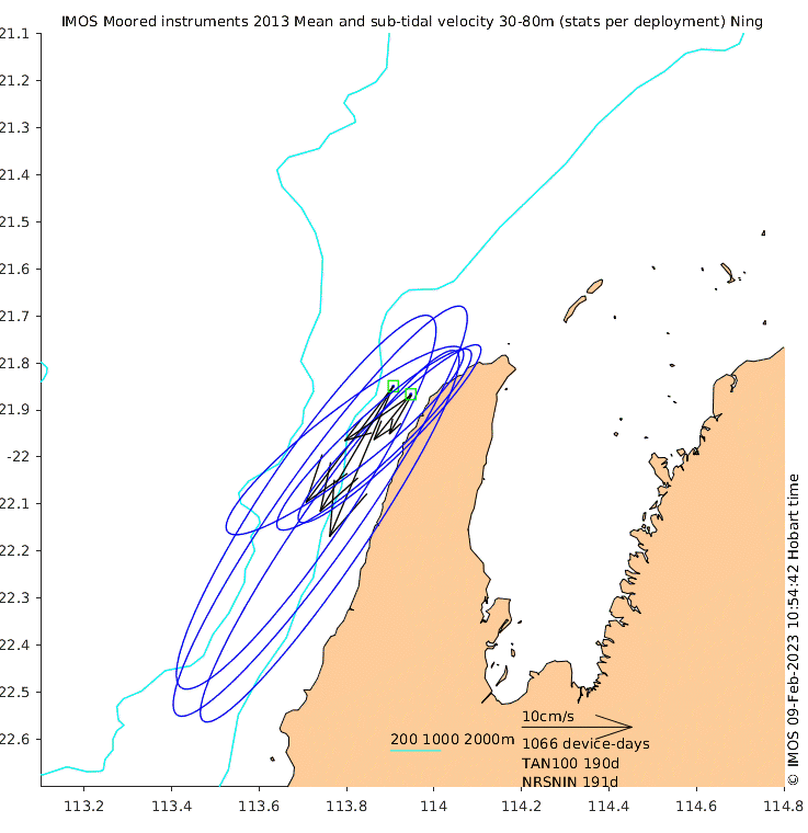 These maps show some basic analyses of the velocity data: mean and sub-tidal variance for several layers and time-windows, and tidal harmonics for the depth-average velocity using the whole record. Click through to see more detailed plots of the selected dataset or to download those data from the AODN thredds server.