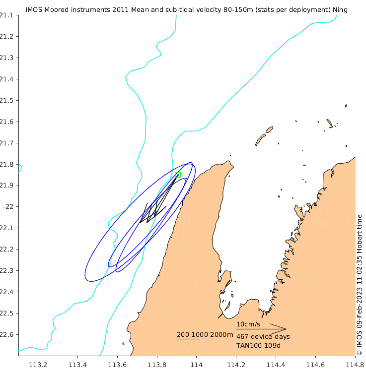 These maps show some basic analyses of the velocity data: mean and sub-tidal variance for several layers and time-windows, and tidal harmonics for the depth-average velocity using the whole record. Click through to see more detailed plots of the selected dataset or to download those data from the AODN thredds server.