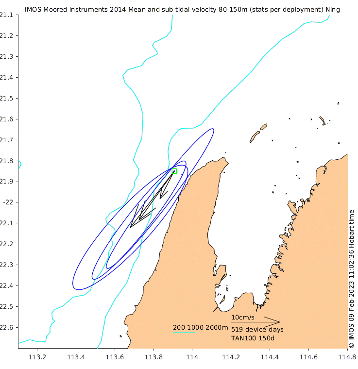 These maps show some basic analyses of the velocity data: mean and sub-tidal variance for several layers and time-windows, and tidal harmonics for the depth-average velocity using the whole record. Click through to see more detailed plots of the selected dataset or to download those data from the AODN thredds server.