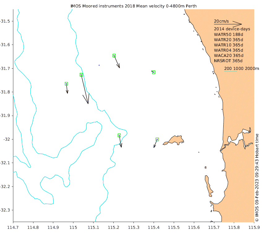 These maps show some basic analyses of the velocity data: mean and sub-tidal variance for several layers and time-windows, and tidal harmonics for the depth-average velocity using the whole record. Click through to see more detailed plots of the selected dataset or to download those data from the AODN thredds server.