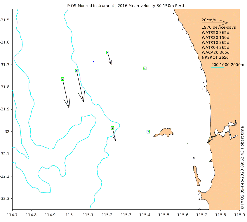 These maps show some basic analyses of the velocity data: mean and sub-tidal variance for several layers and time-windows, and tidal harmonics for the depth-average velocity using the whole record. Click through to see more detailed plots of the selected dataset or to download those data from the AODN thredds server.