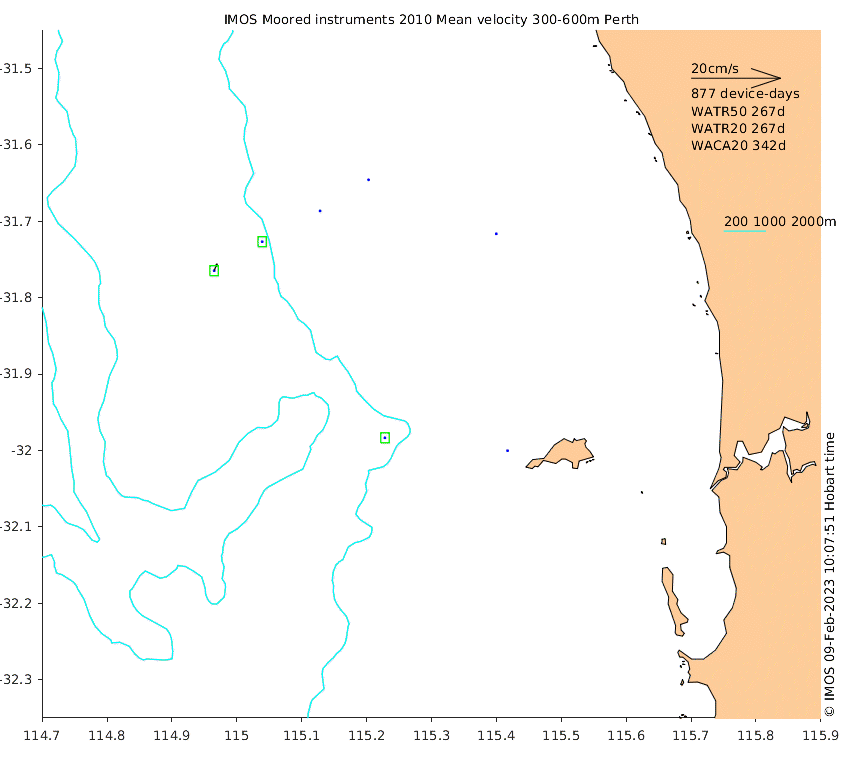These maps show some basic analyses of the velocity data: mean and sub-tidal variance for several layers and time-windows, and tidal harmonics for the depth-average velocity using the whole record. Click through to see more detailed plots of the selected dataset or to download those data from the AODN thredds server.