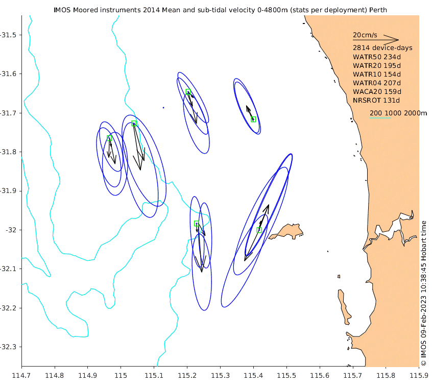 These maps show some basic analyses of the velocity data: mean and sub-tidal variance for several layers and time-windows, and tidal harmonics for the depth-average velocity using the whole record. Click through to see more detailed plots of the selected dataset or to download those data from the AODN thredds server.