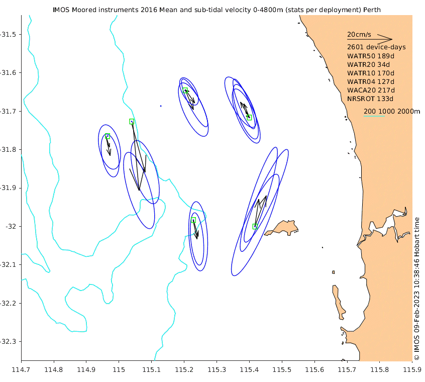 These maps show some basic analyses of the velocity data: mean and sub-tidal variance for several layers and time-windows, and tidal harmonics for the depth-average velocity using the whole record. Click through to see more detailed plots of the selected dataset or to download those data from the AODN thredds server.