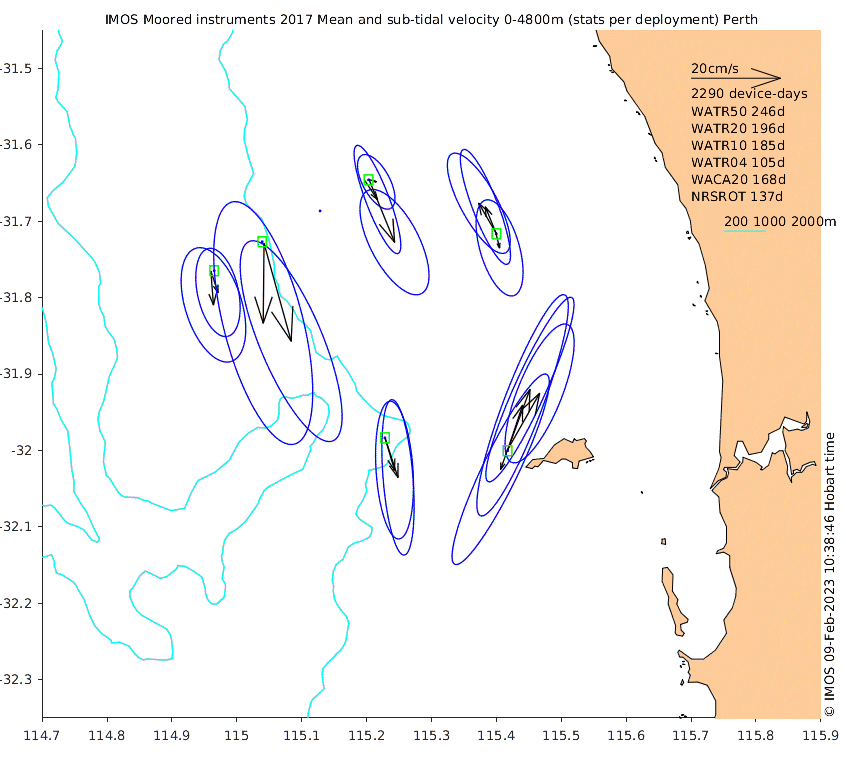 These maps show some basic analyses of the velocity data: mean and sub-tidal variance for several layers and time-windows, and tidal harmonics for the depth-average velocity using the whole record. Click through to see more detailed plots of the selected dataset or to download those data from the AODN thredds server.