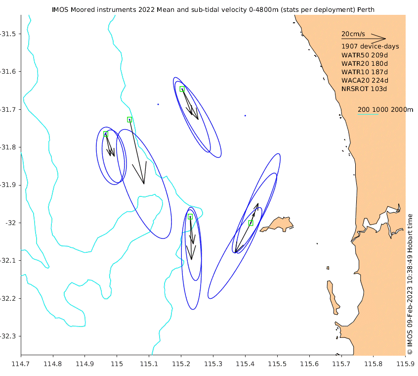 These maps show some basic analyses of the velocity data: mean and sub-tidal variance for several layers and time-windows, and tidal harmonics for the depth-average velocity using the whole record. Click through to see more detailed plots of the selected dataset or to download those data from the AODN thredds server.