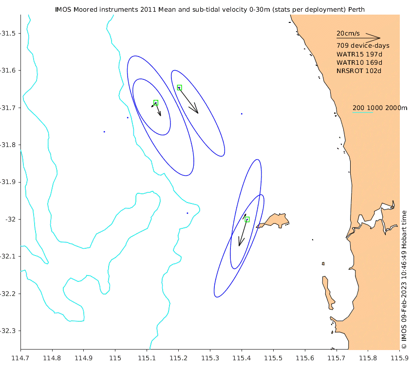 These maps show some basic analyses of the velocity data: mean and sub-tidal variance for several layers and time-windows, and tidal harmonics for the depth-average velocity using the whole record. Click through to see more detailed plots of the selected dataset or to download those data from the AODN thredds server.