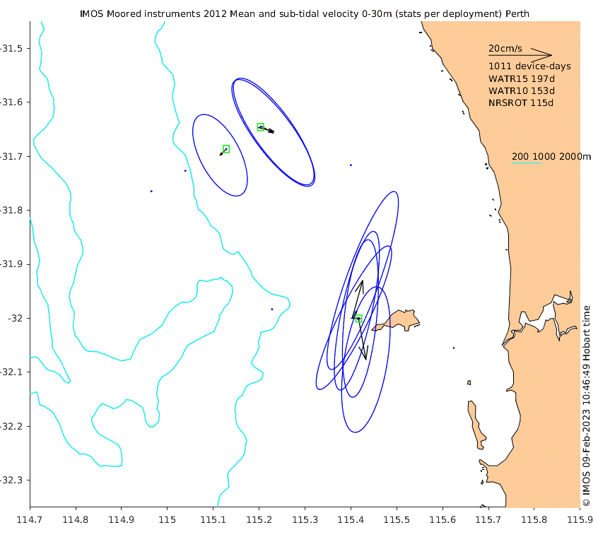These maps show some basic analyses of the velocity data: mean and sub-tidal variance for several layers and time-windows, and tidal harmonics for the depth-average velocity using the whole record. Click through to see more detailed plots of the selected dataset or to download those data from the AODN thredds server.