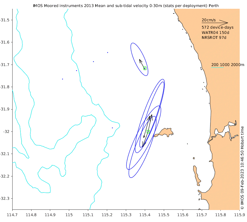 These maps show some basic analyses of the velocity data: mean and sub-tidal variance for several layers and time-windows, and tidal harmonics for the depth-average velocity using the whole record. Click through to see more detailed plots of the selected dataset or to download those data from the AODN thredds server.