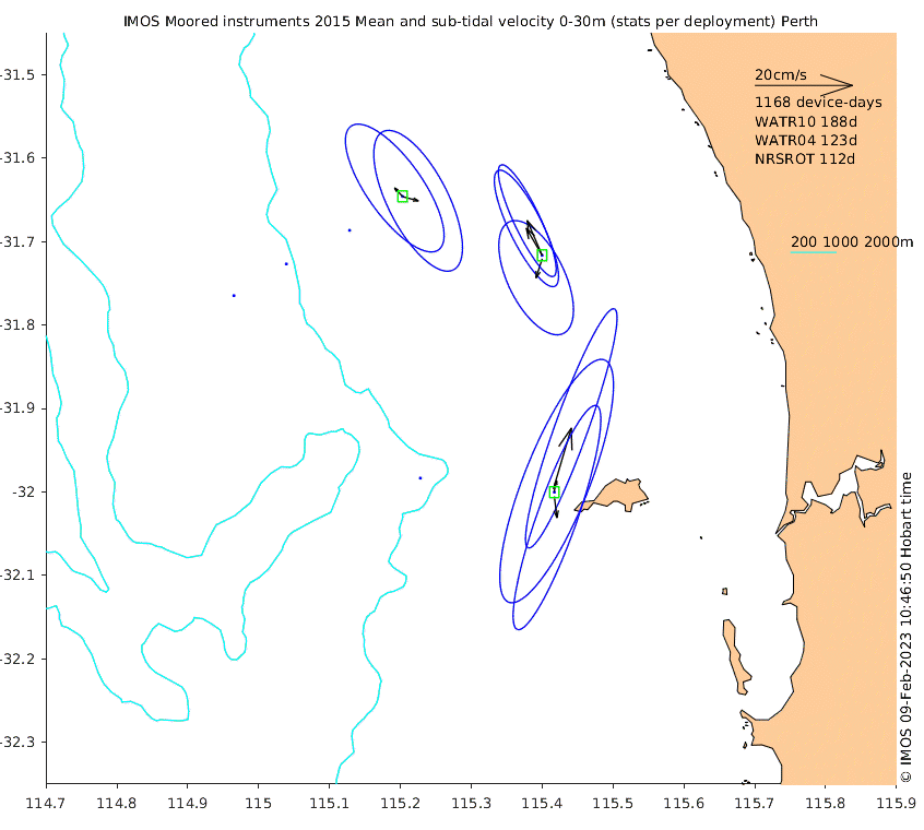 These maps show some basic analyses of the velocity data: mean and sub-tidal variance for several layers and time-windows, and tidal harmonics for the depth-average velocity using the whole record. Click through to see more detailed plots of the selected dataset or to download those data from the AODN thredds server.