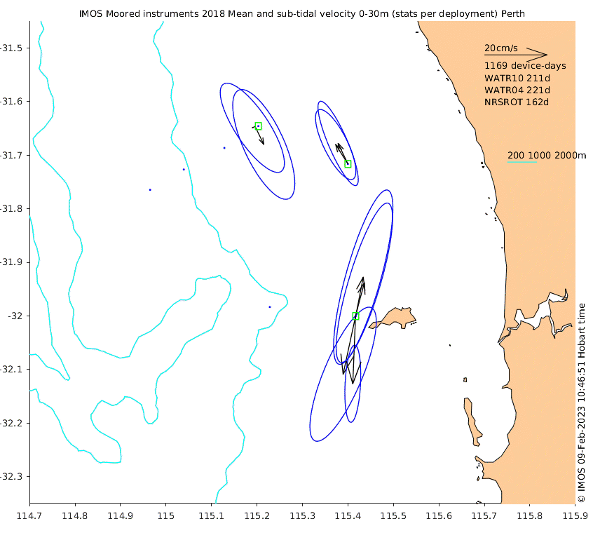 These maps show some basic analyses of the velocity data: mean and sub-tidal variance for several layers and time-windows, and tidal harmonics for the depth-average velocity using the whole record. Click through to see more detailed plots of the selected dataset or to download those data from the AODN thredds server.