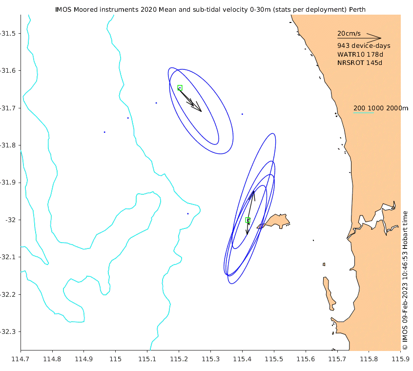 These maps show some basic analyses of the velocity data: mean and sub-tidal variance for several layers and time-windows, and tidal harmonics for the depth-average velocity using the whole record. Click through to see more detailed plots of the selected dataset or to download those data from the AODN thredds server.