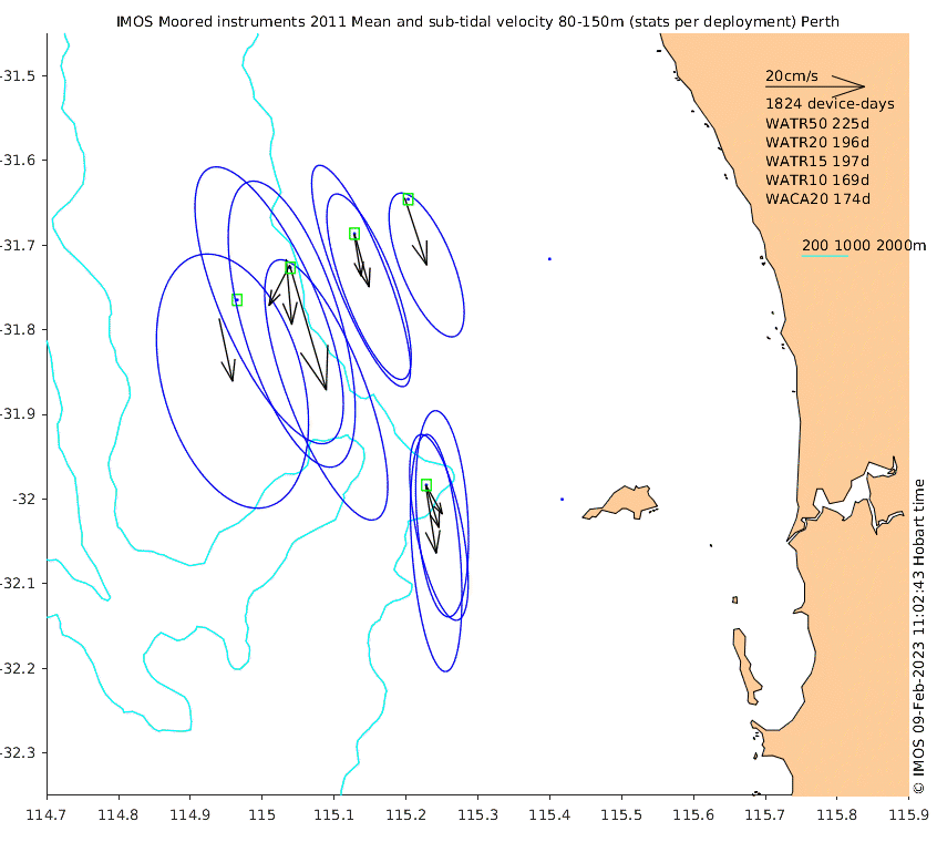 These maps show some basic analyses of the velocity data: mean and sub-tidal variance for several layers and time-windows, and tidal harmonics for the depth-average velocity using the whole record. Click through to see more detailed plots of the selected dataset or to download those data from the AODN thredds server.