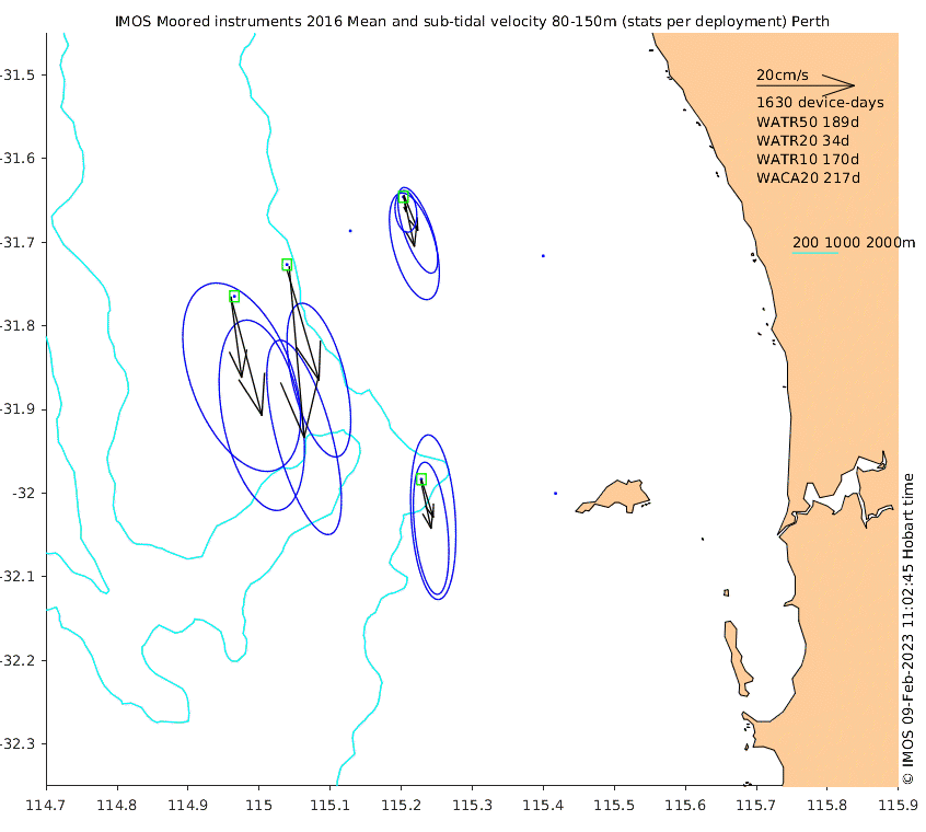 These maps show some basic analyses of the velocity data: mean and sub-tidal variance for several layers and time-windows, and tidal harmonics for the depth-average velocity using the whole record. Click through to see more detailed plots of the selected dataset or to download those data from the AODN thredds server.
