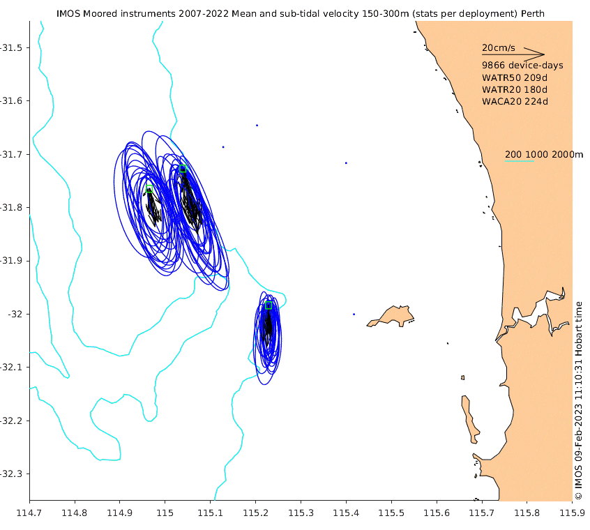 These maps show some basic analyses of the velocity data: mean and sub-tidal variance for several layers and time-windows, and tidal harmonics for the depth-average velocity using the whole record. Click through to see more detailed plots of the selected dataset or to download those data from the AODN thredds server.