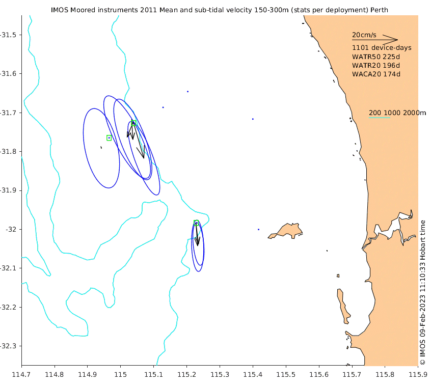 These maps show some basic analyses of the velocity data: mean and sub-tidal variance for several layers and time-windows, and tidal harmonics for the depth-average velocity using the whole record. Click through to see more detailed plots of the selected dataset or to download those data from the AODN thredds server.