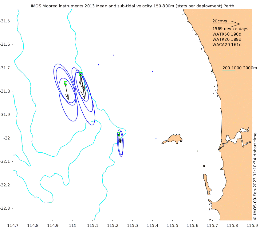 These maps show some basic analyses of the velocity data: mean and sub-tidal variance for several layers and time-windows, and tidal harmonics for the depth-average velocity using the whole record. Click through to see more detailed plots of the selected dataset or to download those data from the AODN thredds server.