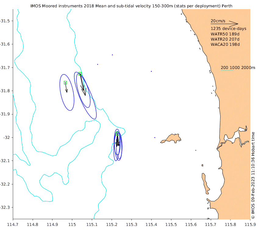 These maps show some basic analyses of the velocity data: mean and sub-tidal variance for several layers and time-windows, and tidal harmonics for the depth-average velocity using the whole record. Click through to see more detailed plots of the selected dataset or to download those data from the AODN thredds server.