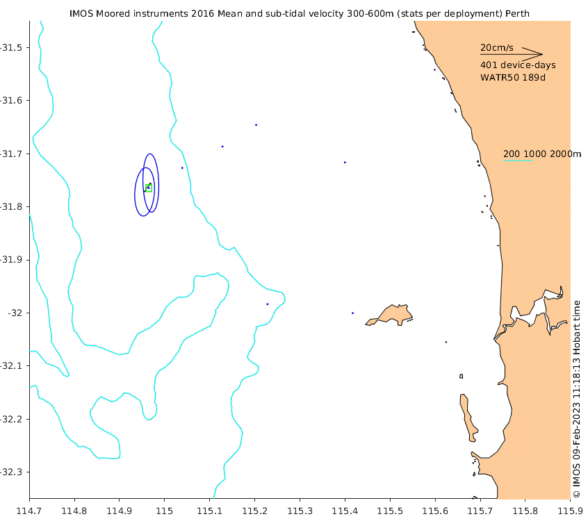 These maps show some basic analyses of the velocity data: mean and sub-tidal variance for several layers and time-windows, and tidal harmonics for the depth-average velocity using the whole record. Click through to see more detailed plots of the selected dataset or to download those data from the AODN thredds server.