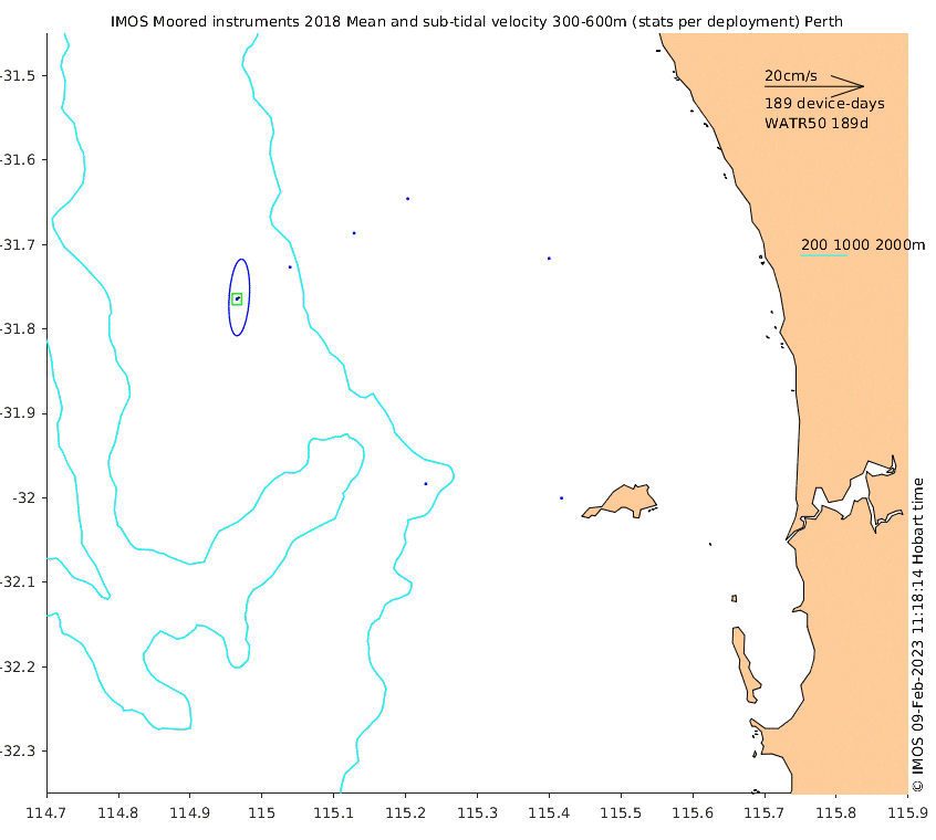 These maps show some basic analyses of the velocity data: mean and sub-tidal variance for several layers and time-windows, and tidal harmonics for the depth-average velocity using the whole record. Click through to see more detailed plots of the selected dataset or to download those data from the AODN thredds server.