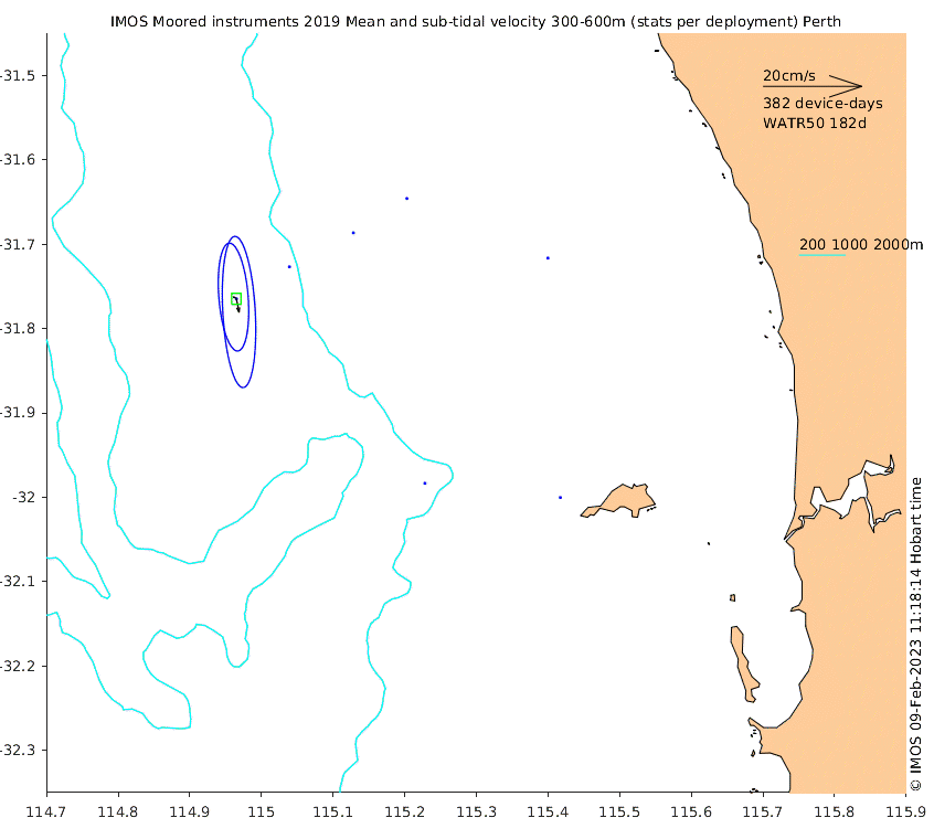 These maps show some basic analyses of the velocity data: mean and sub-tidal variance for several layers and time-windows, and tidal harmonics for the depth-average velocity using the whole record. Click through to see more detailed plots of the selected dataset or to download those data from the AODN thredds server.
